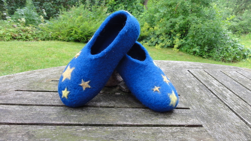 Mit nass aufgefilzten Sternen in gelb, die zum Teil durch Stickerei hervorgehoben werden. 3-D-Effekt!